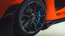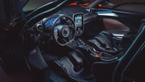 Turns out there’s quite a lot going on under those arches. Bespoke Pirelli P Zeroes (or Trofeos as a no-cost option), McLaren’s first centre-locking lightweight wheels and a new breed of carbon ceramic brake discs known as CCM-R. Because the material is four-times more thermally efficient than previous carbon ceramics, they’re actually smaller and therefore lighter. One slight catch: each disc takes seven months of layering and curing to produce. There’s also the latest generation of McLaren’s RaceActive Chassis Control II hydraulic suspension, that does away with mechanical anti-roll bars thanks to interconnected dampers, and slams the car 50mm closer to the tarmac in Race mode, tucking the wheels efficiently behind the arches.