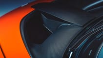 That roof snorkel looks mean, but has been tuned so the sound of air rushing in and mixing in the plenum takes care of the high frequencies, while the low notes are provided by the engine via unique mounts that purposefully vibrate the carbon-fibre tub. On top of that the extraordinary triple-exit titanium and inconel exhaust, positioned to keep the hot gases away from the wing, delivers sheer volume to match the violent design.