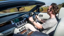 Listen, you don’t drive a Rolls, you experience it. This is the world’s stiffest four-seater convertible, and it certainly feels like the least tremulous open-top car we’ve driven. It’s 24mm wider than the Ghost, and the wheelbase is 180mm shorter. The car’s centre of gravity is lower, too, and the suspension has been reworked with new air springs and active roll bars. This is not a car you’d be naturally inclined to hustle, but if you do give it the hurry-up the Dawn disguises its weight (all 2560kg of it) and handles with amazing alacrity.